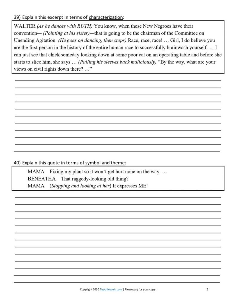 The sample A Raisin in the Sun test contains 40 final exam items, but the test maker resource contains 145 test questions and an answer key. You can remove, customize, and add exam items easily using MS Word or Google Docs. If you have found the A Raisin in the Sun questions and answers helpful, consider using the entire unit.